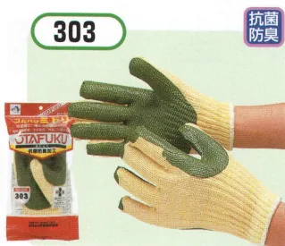 303 ゴムバリミドリ(5双入) やわらかく荷運搬に最適。 ゴムコーティング、7G厚手。丈夫な原手に強力ゴム糊でゴムシートを貼り合わせた強力グリップが特長の手袋。通気性が良くムレにくく快適。 ※5双入り。 ■手袋/ポリエステル ・アクリル・ナイロン 掌部/天然ゴム: ■抗菌防臭: ■: