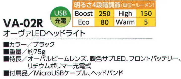 特長/オーバルビームレンズ、暖色サブLED、フロントバッテリー、リチウムポリマー充電式 付属品/MicroUSBケーブル、ヘッドバンド
