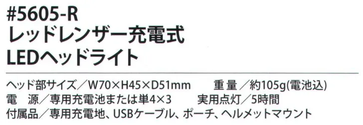 明るさ180ルーメン 専用充電池を単体で充電できる! 乾電池式・充電式兼用(充電時間:約4時間) 防水・防塵規格IPX6 下方可動式ヘッド 電源/専用充電池または単4×3 実用点灯/5時間 付属品/専用充電池、USBケーブル、ポーチ、ヘルメットマウント ■: ■重量/約105g(電池込): ■W70×H45×D51mm: