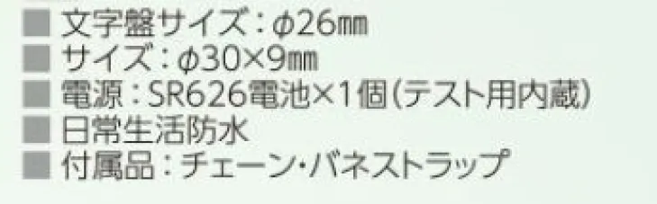 ◎チェーンとバネストラップを用途に応じて取り換えることができます。 ■: ■日常生活防水: ■文字盤サイズ直径26mm、サイズ:直径30×9mm 付属品:チェーン・バネストラップ ◎電源:SR626電池×1個(テスト用内臓):