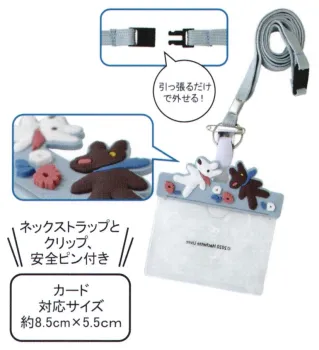 ネックストラップ、クリップ、安全ピンと使用状況に応じて選択できる3WAYタイプのネームホルダーです。ネームのサイズは、8.5×5.5cmまで対応。文字が読めない未就学児でも、キャラクターと色で覚えてもらえます。ネックストラップは引っ張ると外れるようになっているので、不慮の事故で首が絞まる状況も回避できます。