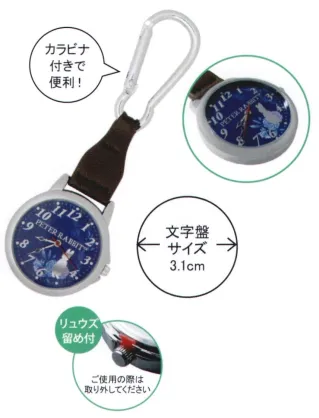ピーターラビット カラビナが付くことで往診の際にバックに取り付けたり、ワゴンに取り付けたり、パンツのベルトホルダー等にも取り付けたりしやすくなっております。 ガラスプリントがおしゃれ! 折り返してスタンド可能! 一分間の脈拍を簡易的に知ることができる目盛付きです。 ■ケース:アロイ合金 裏蓋:ステンレス 風防:ミネラルガラス ベルト部分:合皮 カラビナ:アルミニウム: ■生産国:中国 動作温度範囲:-5℃~+50℃ 常温携帯精度:月差±30秒以内: ■駆動方式:ステップモーター式 サイズ:約φ3.7×D0.9cm・全長約11cm 文字盤サイズ:3.1cm 電池:SR626 ※初回モニター用電池使用: