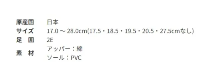【お取扱いのご注意】 ●人工皮革・繊維 1.柔らかい布に水を含ませて軽くふきながら汚れを落としていきます。 2.軽く乾拭きし、人工皮革にはレザー用靴クリーナーを柔らかい布につけ、 薄く伸ばしながら汚れを拭き取ります。 3.風通しの良い日陰で乾かします。 ■アッパー:綿 ソール:PVC: ■日本製 自社の国内工場(福岡県久留米市)でつくられた製品です。: ■足囲:2E: