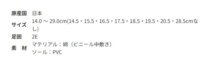 ★14.0~22.5cmの商品もございます。(KD38003-A) ■マテリアル:綿(ビニール中敷き) ソール:PVC: ■日本製 自社の国内工場(福岡県久留米市)でつくられた製品です。 丸洗いOK そのまま洗濯機に入れて洗うことができます。(お使いの洗濯機の取扱説明書をよくご確認ください。) 通気性 通気性にすぐれた素材を使用しています。 汚れにくい底 床を汚しにくい特殊配合の素材でつくられた靴底です。 抗菌配合ソール 抗菌効果が期待できる配合を施した靴底を採用しています。: ■足囲:2E: