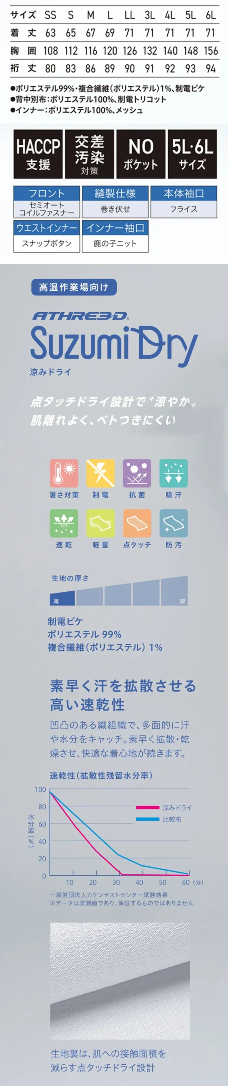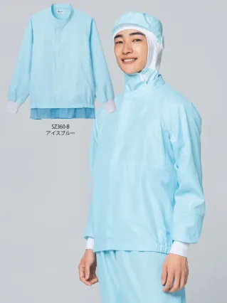 SZ360-B 【涼みドライ】長袖ジャンパー(アイスブルー)涼みドライ 長袖ジャンパー アイスブルー 動きやすさを追求し、体への衣服圧を大幅にカットした長袖ジャンパー「ATHREED(R)」(アスリード)。 再生PET由来の抗菌糸で半永久的に抗菌性を保つ高機能素材。 高温作業場におススメ。 凹凸のある織組織で、多面的に汗をキャッチ。素早く拡散・乾燥させ、快適な着心地が続きます。 特徴・フロント部分は作業中に衣服が開かないセミオートロック仕様のファスナー ・縫い代の巻き伏せ仕様でほつれの発生による異物混入の防止 ・袖口部分フライス仕様で体毛の落下を防止しながら長時間の着用でも快適 ・ウエストインナー スナップボタンできちんとパンツイン ・裾のはみ出しがひと目でわかる、異物混入対策をより強化する色付きインナー ・3色展開なので交差汚染対策に。 ・ノーポケットなので危険物や私物の持ち込みリスクを最小限に抑えられます 仕様・品番:SZ360-B ・カラー:アイスブルー(ホワイト(CT360-W)や、ネイビー×アイスブルー(CT360-NB)もございます) ■本体:制電ピケ(ポリエステル99%複合繊維(ポリエステル)1%)/インナー:メッシュ(ポリエステル100%)/背中別布:制電トリコット(ポリエステル100%): ■制電/抗菌/吸汗/速乾/軽量/点タッチ/防汚/ベトつきを軽減する涼感素材: ■HACCP支援/ウエストベルト脇ゴム入/気づきインナー/袖口フライス: