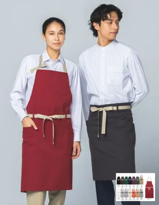 ・胸当てスタイルと腰下スタイルの2WAY仕様で状況に合わせた着用が可能・全15色のカラーバリエーションで店舗コンセプトに合わせたコーディネートが自在・防汚・撥水加工で食品の汚れから衣服をしっかり保護・耐久性に優れた素材で長期間使用しても型崩れしにくい・SDGs対応の環境に配慮した素材と製造工程・HACCP対応で衛生管理が重要な食品取扱現場にも安心