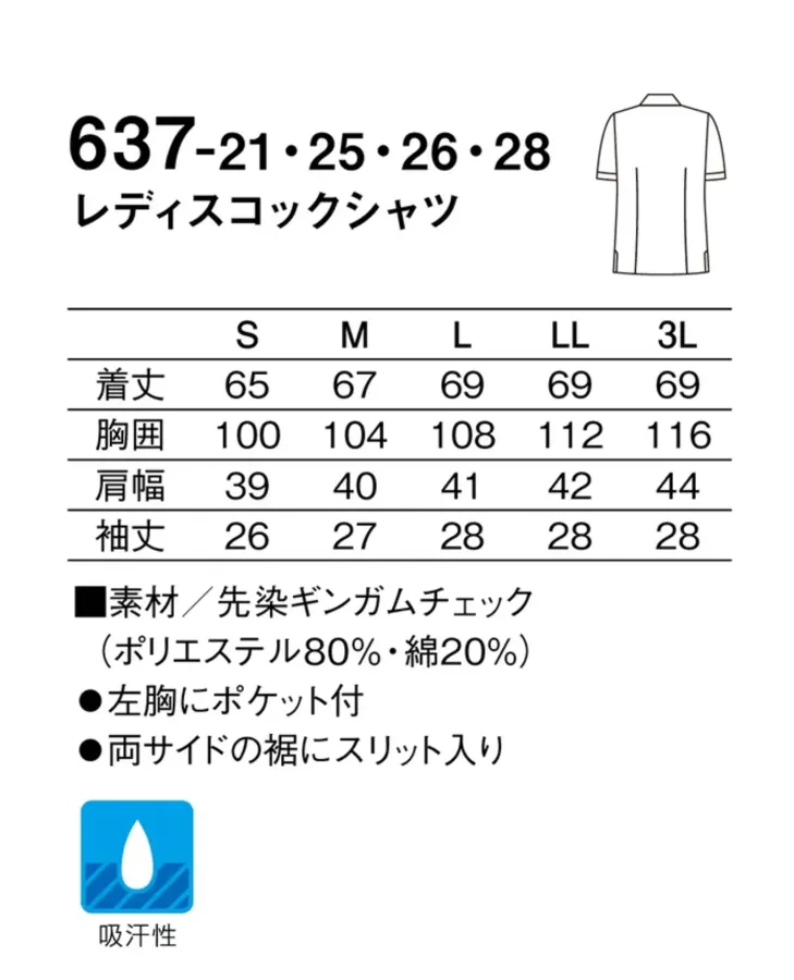 637-26 レディスコックシャツ優しい雰囲気の丸衿と、衿まわりのラインがポイントのレディスコックシャツ。 ■ギンガムチェック ポリエステル80%・綿20%: ■格子柄のなかでも最もシンプルな柄で白糸と染糸の2色で織り上げたチェック柄です。糸の段階で染めてから織り上げる「先染め」にしているので色落ちの問題もありません。: ■左胸ポケット付き 両サイドの裾にスリット入り: