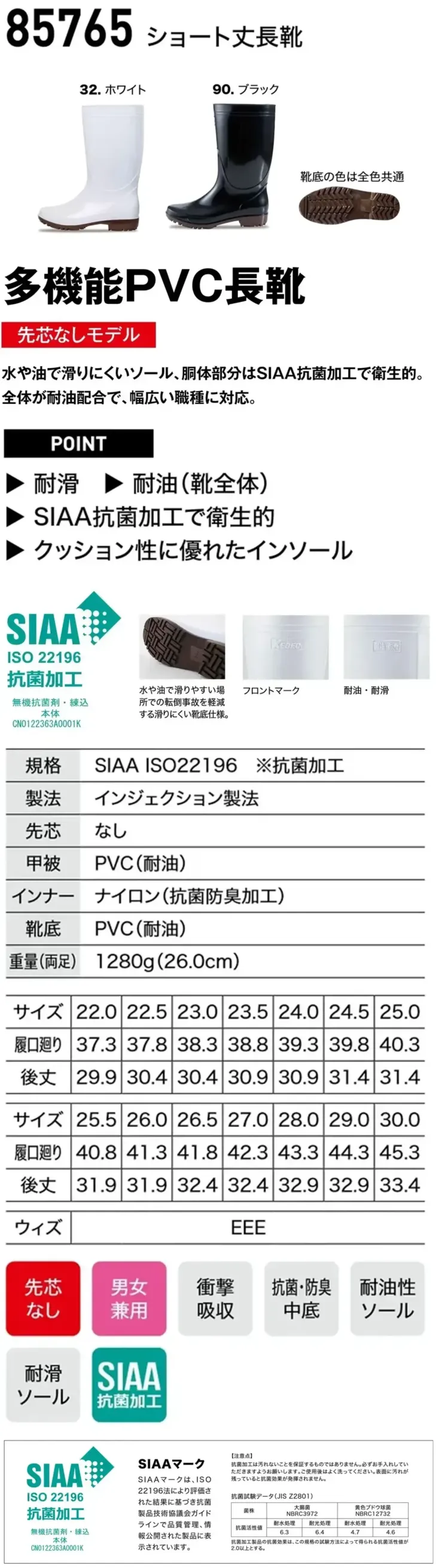 85765 ショート丈長靴多機能PVC長靴 水や油で滑りやすい場所での転倒事故を軽減する滑りにくい靴底仕様の長靴。 特徴・水や油に強い耐滑ソール。 ・靴全体が耐油仕様。 ・胴体部分はSIAA抗菌加工で衛生的。 ・中底は抗菌・防臭 ・クッション性に優れたインソール ★ロング丈の商品もございます(品番85766) ★先芯入りの商品もございます(品番85767) 仕様品番:85765 品名:ショート丈長靴 重量(両足):約1280g ■[甲被]PVC(耐油) [インナー]ナイロン(抗菌防臭加工) [靴底]PVC(耐油): ■インジェクション製法・耐滑・耐油・SIAA抗菌加工・抗菌防臭中底: ■ショート丈・クッションインソール・衝撃吸収: