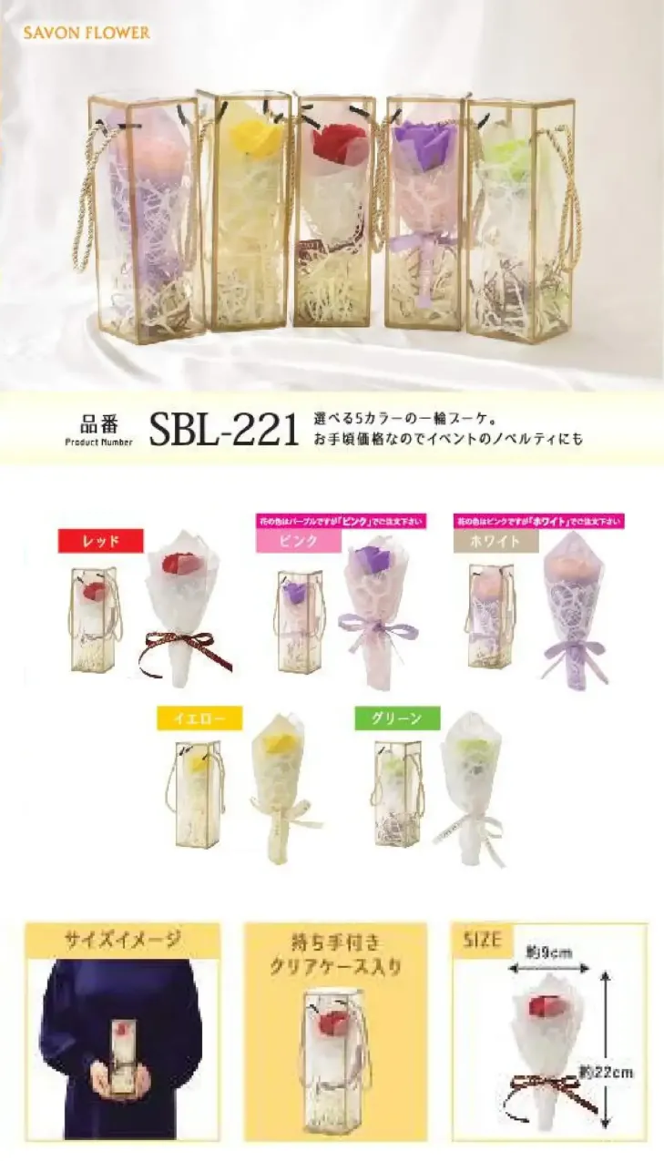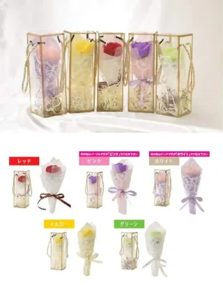 選べる5カラーの一輪ブーケ。お手頃価格なのでイベントのノベルティにも。※色名について:色名「ピンク」は花色がパープルです。色名「ホワイト」は花色がピンクです。