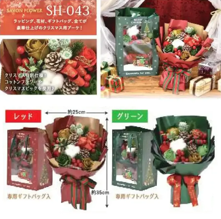 ラッピング、花材、ギフトバッグ、全てが豪華仕上げのクリスマス用ブーケ!コットンフラワーやクリスマスピックを使用した特別仕様♪