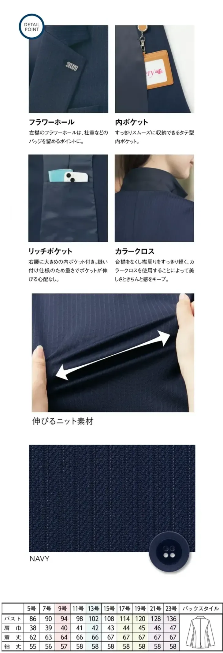 S-25281 ジャケット素肌に溶け込む。これまでよりもっと軽く、なめらかに。 驚くほど軽やかでストレスフリーな着心地を実現。 高機能な4種の糸を使い、奥行きのあるストライプ柄を表現しました。 特徴●ストレッチ性、吸水速乾性を兼ね備えた糸を使用 ●環境に配慮した再生ポリエステル糸を使用 ●織物の様なストライプ柄を表現したオリジナル素材 ●軽やかで滑らかな質感が特徴 ●左襟のフラワーホールは、社章などのバッジを留めるポイントに。 ●すっきりスムーズに収納できるタテ型内ポケット。 ●右腰に大きめの内ポケット付き。縫い付け仕様のため重さでポケットが伸びる心配なし。 ●台襟をなくし襟周りをすっきり軽く、カラークロスを使用することによって美しさときちんと感をキープ。 ●体型を自然にカバーし、美しく見せるこだわり設計。動きやすさと美しさを両立し、すべてのサイズで快適な着心地を実現。