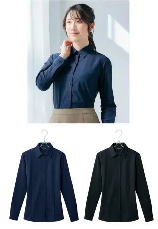 シンプルなデザインで着回しやすい長袖ブラウスです。無駄のないラインと程よい光沢感が、オフィススタイルを上品に演出します。日常の業務から来客対応まで幅広く対応可能です。