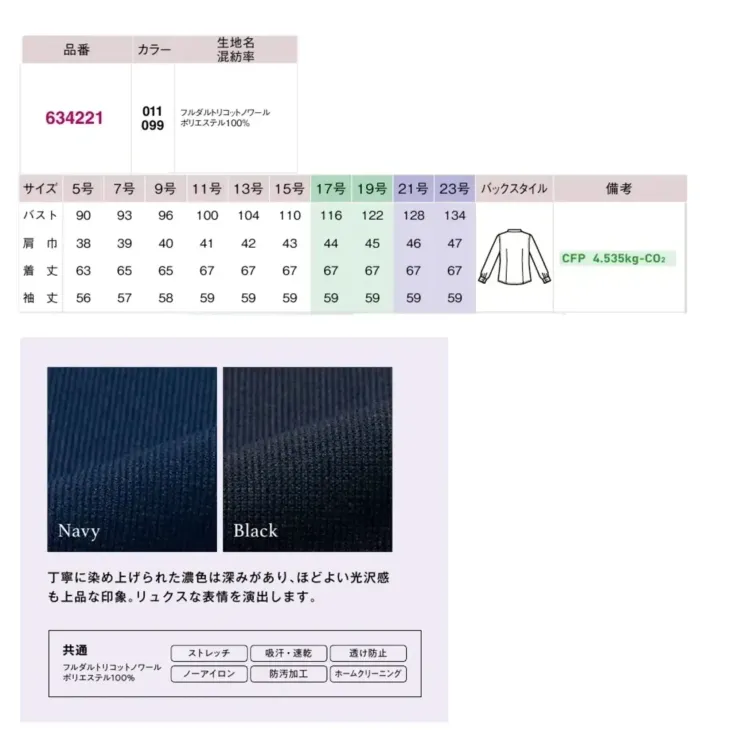 ・襟元を美しく見せるデザイン・長袖仕様でオールシーズン対応・上質感のある生地で快適な着心地・ストレッチ入りで動きやすい・家庭洗濯可能でケアも簡単
