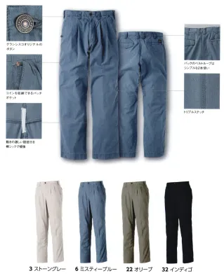 着こなすほどにあなたのものになる「グランシスコシリーズ」。高品質のコーマバーバリー素材にピグメント染めを施し、長時間のバイオウォッシュ加工で自然な色落ちと着慣れた風合いを実現。ハードな動きに耐えるトリプルステッチがカジュアルな存在感をアピール。素材・色・縫製・洗い、その工程すべてにこだわりを持った絶大な人気を誇るシリーズです。  ※製品洗いの商品は、色のニュアンスやサイズが多少異なる場合がございます。ご了承ください。 ※「2 ハンターグリーン」「4ベージュ」「46 モカブラウン」は、販売を終了致しました。 ■コーマバーバリー ピグメントバイオウォッシュ 綿100%: ■製品洗い: ■グランシスコオリジナルのボタン コインを収納できるパッチポケット トリプルステッチ 動きの激しい股部分を棒シックで補強 バックのベルトループはシンプルな2本使い: